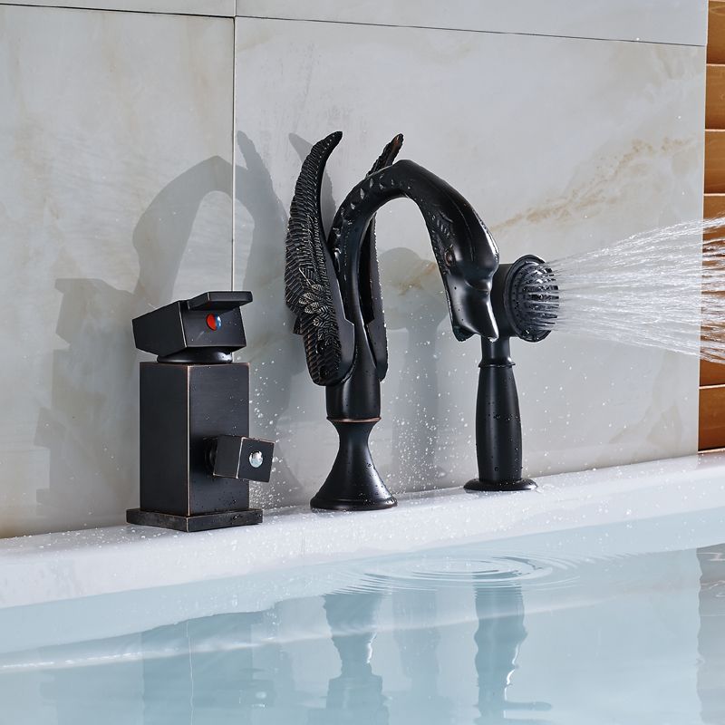2019 Wholesale And Retail Unique Design Bathroom Faucet Widespread Single Handles Deck Mounted With Black Swan Sink Mixer Tap Oil Rubbed Bronze From